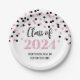 Customisable graduation party class of 2024 plates in glamourous pink and black confetti pattern and elegant hand lettered style text.
