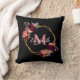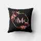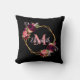 A faux gold geometric frame decorated with watercolored flowers, roses in burgundy and pink and boho style feathers. A chic black coloured background. Templates for Your name and monogram letter. The name in pink is written with a modern and trendy hand lettered style script. The monogram letter in coral.