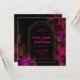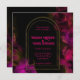 Elegant square black Wedding invitation with print and text on two sides. Featuring an ink design in gold and pink with an arch for the hot pink text.