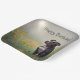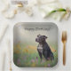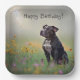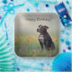 These birthday paper plates feature a handsome black and white Pitbull against an atmospheric background.