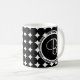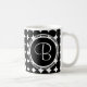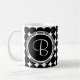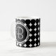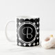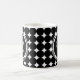 Black dots in close quarters create a secondary pattern of white stars. A large black circle is surrounded by white lines, while a single white initial graces the centre.