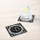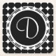 Black dots in close quarters create a secondary pattern of white stars. A large black circle is surrounded by white lines, while a single white initial graces the centre.