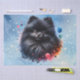 A highly detailed and vibrant illustration of a fluffy black Pomeranian dog, featuring expressive eyes and a soft, voluminous coat. The background is a dynamic splash of colourful watercolor splashes, creating an artistic and playful atmosphere. The dog's fur is accentuated, capturing the light and texture, emphasising its adorable personality.