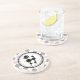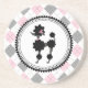 A coaster featuring an illustration of a black poodle with pink bow and collar inside a decorative black circle. Background is pink and grey argyle.