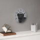 Destei's original cartoon illustration of a cute black coat colour Pug breed dog's head. The background colour is grey with a decorative texture. The texture can be removed and the background colour can be changed to any other colour, if so wished. The hours are marked with numbers. The hours and minutes are shown with a dotted clock face. There is also a personalizable text area for a name or other custom text.