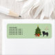 Destei's original cartoon illustration of a cute black coat colour Pug breed dog. The dog is standing by a festive Christmas tree decorated with red and yellow ornaments, a white pearl garland and a yellow star that is placed on the top of the tree. There are also two wrapped presents by the tree and behind the dog there is a brown shelf with two candles. The background colour is light green. Next to the design there is a personalizable text area.