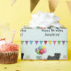 Destei's original cartoon illustration of a cute black coat colour Pug breed dog. The dog is placed in a colourful birthday setting. There is a birthday cake with some candles on it, colourful birthday balloons and a bunting banner as well as two present boxes. There is also a personalizable text area.