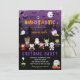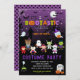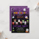 Invite your friends for some spooky fun with this black and purple bootastic Halloween costume party invitation. This design features a black and purple spooky house, sky and tree background with ghosts, bats, spiders and all your friends dressed in their best costumes.