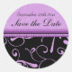 Save the date envelope seals for wedding, in elegant black and purple with swirly design, the perfect addition to your save the date card envelopes, available in matching cards, magnets and stamps.