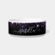 A stylish black background, decorated with purple faux glitter dust. Personalise and add your name written with a trendy hand lettered style script with swashes.