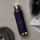 Black purple spider web Halloween pattern Water Bottle. Drinkware with Spooky Halloween cobweb gothic design and custom black background.