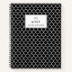 Black Quatrefoil Pattern Personalised Notebook. Customisable notebook featuring black and white quatrefoil pattern, modern calligraphy, simple typography and bow accent. This modern notebook will be perfect as a personalised gift. Mix and match with other colours and items.
