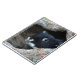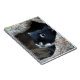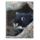 Adorable black and white bunny poking it's head out of the hollow of a tree.