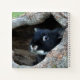 Adorable black and white bunny poking it's head out of the hollow of a tree.