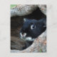 Adorable black and white bunny poking it's head out of the hollow of a tree.
