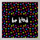 A colourful , fun poster that features a confetti polka dots pattern in black and rainbow and the words ‘be kind’ in the centre . Text can be personalised.
