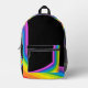 Go back to school in style with this rainbow print backpack. Fun book bag features cool abstract rainbows in multiple sizes, against a black background , with black details. Original digital artwork by Buttercup's Clothing and Collectables.