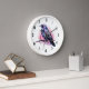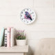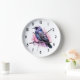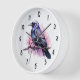 A clock with an image of a black crow with purple pink wings. A pink watercolor splatter behind this lovely mystical bird.