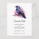 Save the date postcard with an image of a black crow with purple pink wings. A pink watercolor splatter behind this lovely mystical bird.