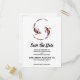 Wedding save the date postcard with a pair of black and red koi fish swimming and circling around each other.