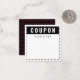 Front: Black dashed line border to look like a coupon clipping. Top section has a black background with white text that says "COUPON" in a strong bold font. Below it is "REDEEM FOR" in a thin black coordinating font. The white area underneath is left blank for your handwritten coupon item text/drawings/notes (including any details such as expiration date, terms & conditions or fine print, if desired).