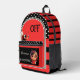 Backpack featuring a cute design with ladybugs, polka dots and stripes. In bright red and black colours. The ladybug images are optional and can be deleted if you prefer. A lovely backpack for a child.