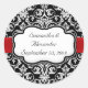 Favour label sticker or envelope seal. Stylish and posh black and white damask background design, with red ribbon and white frame shape. A cute wedding invitation and matching set collection. All Designs Copyright © www.CustomInvitesOnline.com