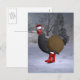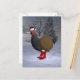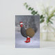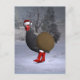 father christmas got a cute chicken as helper this year - happily dashing with red boots and hat through the snow at winter time