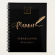 A chic black background, decorated with a feather pen. Personalise and add your business, company logo, name and year. Golden text: Planner