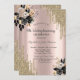 A modern, chic, and glamourous with gold glitter drips, and black roses on a rose gold background.