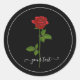Add a bold and romantic touch to your gifts, packaging, or correspondence with this elegant round sticker featuring a hand-drawn red rose on a deep black background. The design combines timeless beauty with a modern edge, making it perfect for weddings, Valentine's Day, small business branding, or heartfelt notes. Customise the text to include names, dates, messages, or a short quote for a truly personal touch.
