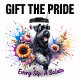 A strong and happy Black Russian Terrier with an open mouth and visible tongue is energetically posed amongst a vibrant yet somewhat muted arrangement of sunflowers, pink peonies, and purple wildflowers. Artistic blue and purple watercolor splashes add a dynamic touch to this powerful canine portrait.