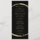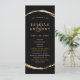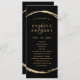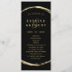 This wedding program features a faux gold circle frame with an elegant ampersand and simple calligraphy with a black background.