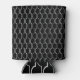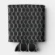 This can cooler has an art deco design of white half circles connect with lines on a field of black.