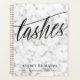 Chic spiral planner or appointment book for a lash artist with lashes written in a black script across a marble background in white and grey. Add your name in elegant black letters.