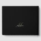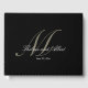 Elegant black and white monogram with bride and groom names and date wedding guest book. Black with white and grey script and plain italic text. Front - bride and groom names in white script overlay a large grey script monogram, wedding date below in white plain italic text. Small monogram on back. Spine with bride and groom and book title in plain italic text.