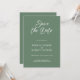 Whimsical minimalistic modern, sage green background, customisable white script calligraphy, elegant wedding save-the-date design. The sage green with customisable white calligraphy evokes a feel of classic elegance.