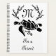 Sea turtle swimming in a tribal silhouette style. While the original was a based of an green tortoise, the shape of the segments bagging to be twisted and turned. Above the shell to the left and right is black seaweed leaving space for text, default is a letter "M" m is short for monogram. And below the turtle are water swirls.