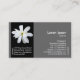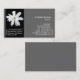 A business or profile card template with a band on the left, with a single flower motif, decorated with vertical text captions labelling the address area and contact details. The reverse of the card has the same colour theme as the front but has been left blank which can be left as is, or further customised. Suitable for a variety of businesses.