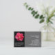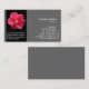 A business or profile card template with a band on the left, with a single flower motif, decorated with vertical text captions labelling the address area and contact details. The reverse of the card has the same colour theme as the front but has been left blank which can be left as is, or further customised. Suitable for a variety of businesses.