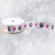 This roll of ribbon is white with pink dots and vibrant pink balloons along with black silhouettes of cat paw prints.
