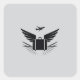 A bold black silhouette design of a suitcase with a plane soaring above, wings angled sharply, reduced to clean geometric forms for a travel-inspired emblem, set against white.
