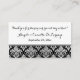 This elegant black and white with silver grey Victorian baroque damask pattern combination reception placecard or escort card (FLAT, NOT FOLDED) and party favour tag matches the 25th wedding anniversary invitation shown below. It is fully customisable. It would also work well for any formal affair. ****PLEASE NOTE if you re-size the card, or if you change fonts, or the size of the font, some of the design and/or text may get cut-off. Everything will print as you see it on your monitor. I will not see your card, and Zazzle will NOT correct anything (typos, alignment etc.). The text and paper is all customisable. If you need help with this card, please email me BEFORE you place your order. If you require any other matching items, please email your request to niteowlstudio@gmail.com.