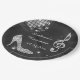 Girl's personalised, elegant custom Retirement party celebration paper plates. Beautiful black and silver templates for a woman's retirement party. These plates have a funky retro disco mirror ball, glamourous printed image rhinestones / diamonds glitter, sequins, jewels sparkle high heels stilettos shoes, and glittery musical note / music note with sparkles on a classy black with white lights and sparkles background. Chic, cute, girly, modern paper plates with trendy, fashionable colours. These cool, groovy, stylish, sophisticated, pretty party plates are decorated / printed on one side only. Perfect plates for dinner dance dancing event parties. PLEASE NOTE: All products on Zazzle have flat printed images. If you need any assistance customising your product please contact me through my store and I will be happy to help.