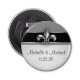 These round, button magnetic bottle openers feature the image of a silver metal style Fleur de Lis in a black and grey colour scheme. The perfect favour for your New Orleans wedding event or Mardi Gras party!