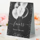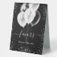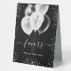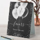 Black background. Decorated with faux silver glitter sparkles and white balloons. With the text: Favours, please take one!