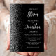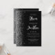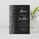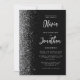 The left-hand edge of this elegant modern wedding invitation features a silver faux glitter border. The customisable text combines pale silver grey script and sans serif fonts on a black background. The reverse side features a matching black and silver design.