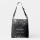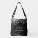 An elegant black background. Decorated with faux silver glitter drips, paint dripping look. Personalise and add your first name, monogram initials and full name. The name is written with a hand lettered style script.