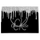 A classic black background with faux silver glitter drips, paint dripping look. Personalise and add a name and monogram initials. The name is written with a modern hand lettered style script. White and grey letters. Perfect for birthdays, bridal shower, baby shower.