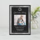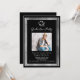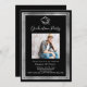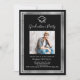 Black background, decorated with a faux silver looking frame, and a graduation cap. Personalise and add a photo name and details. White text.